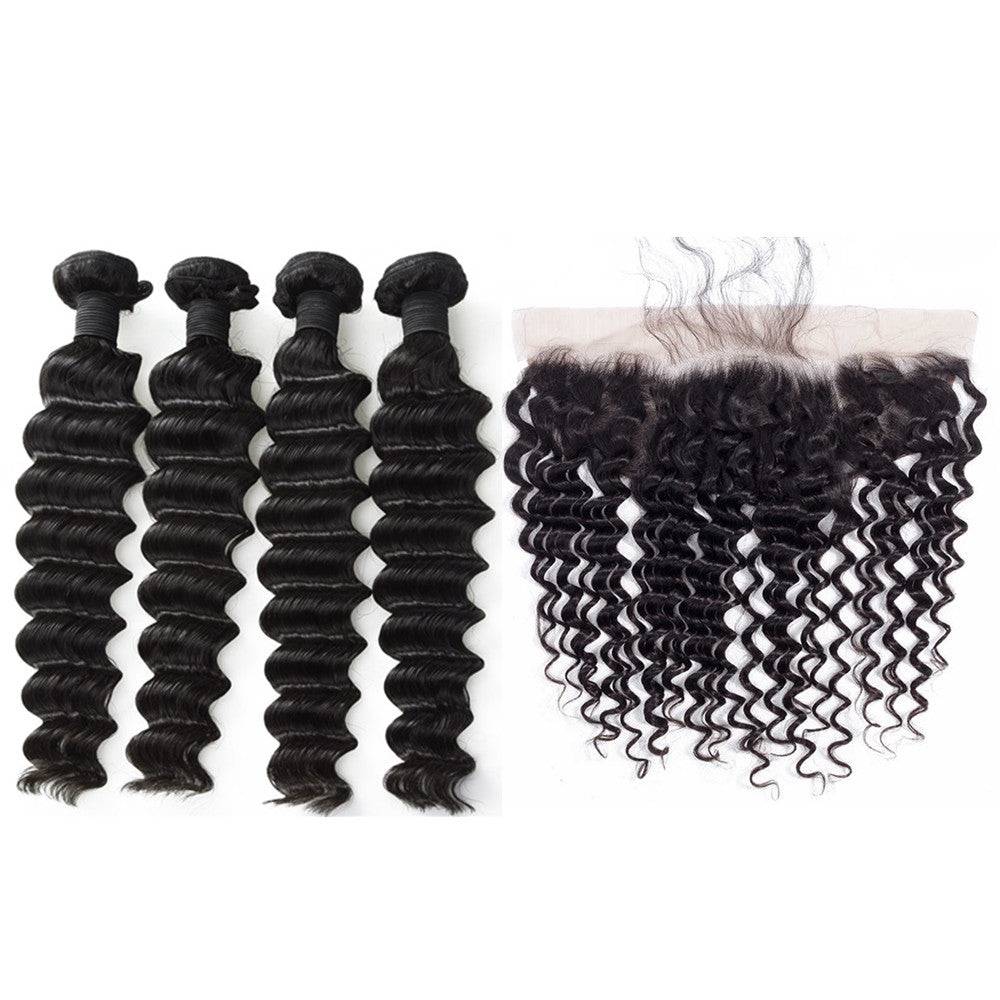 Wolf king deep wave 4 bundles with 13*4 HD transparent frontal natural color virgin human hair weft