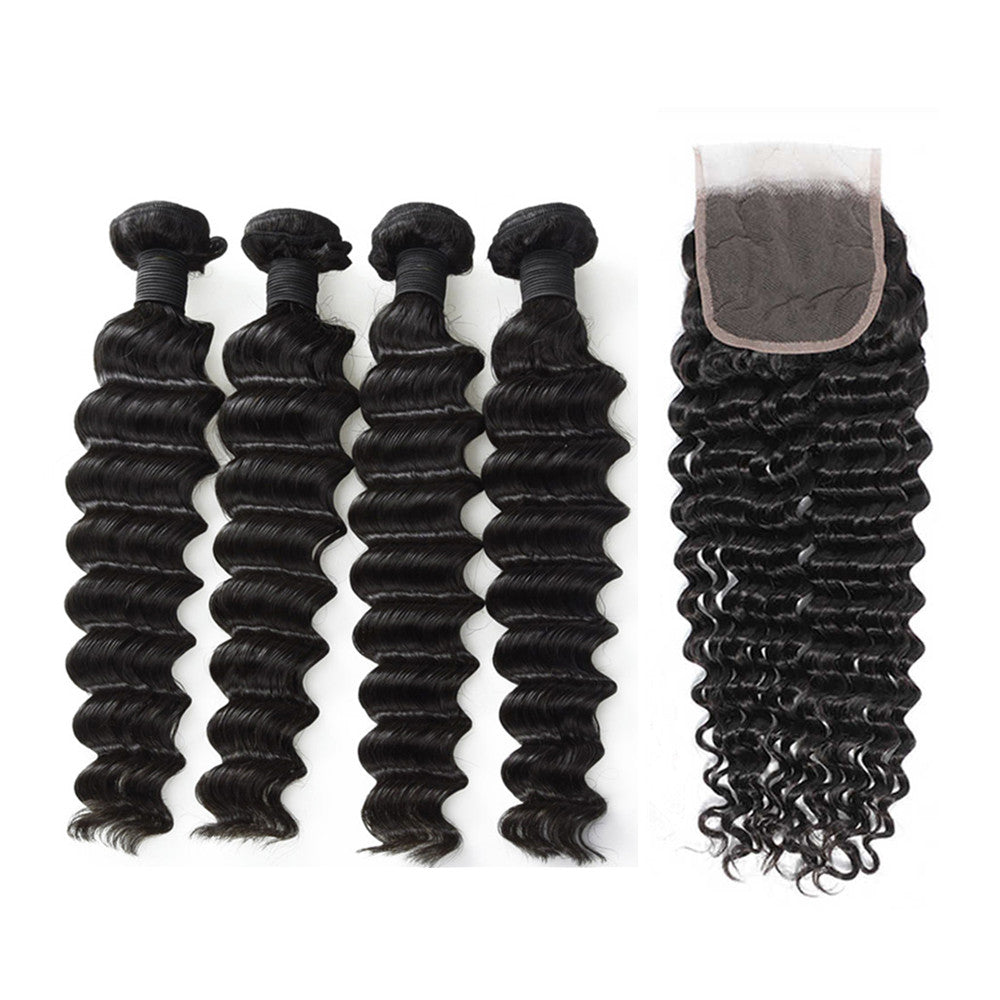 Wolf king deep wave 4 bundles with 4*4 HD transparent closure natural color 100% human hair